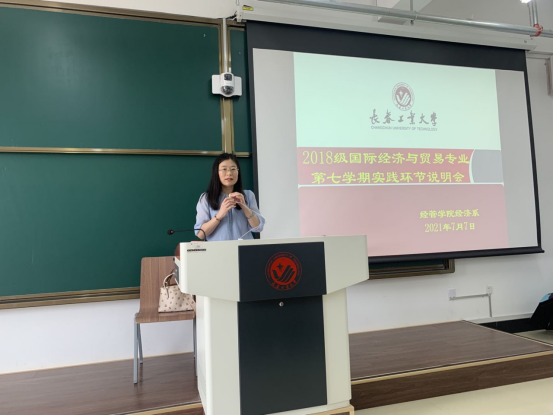 为了使教师和学生更加了解第七学期实践环节的相关工作安排,由经济系副主任高鹤牵头,于2021年7月7日在北湖东区教学主楼419教师召开2018级国际经济与贸易专业第七学期实践环节说明会,国贸专业全体教师和2018级国贸学生参加了本次说明会。