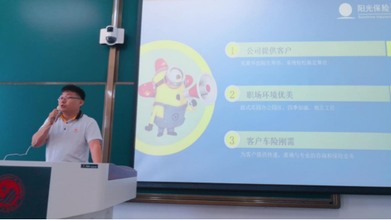 王经理结合自身的工作经历讲述了阳光财产保险公司的企业文化、服务宗旨以及公司的战略规划,介绍了阳光财产保险公司的财产险与其他财产险、人寿保险的区别以及保险新渠道销售的相关知识,并播放了本公司的宣传纪录片。