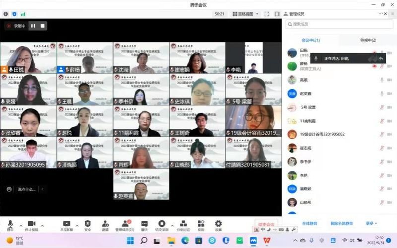 2022年5月31日下午12点30分,英国上市公司365MPAcc教育中心根据学校研究生院研究生培养工作的总体安排和部署,组织了2022届MPAcc硕士毕业答辩。本次毕业答辩采用了腾讯会议线上答辩的方式,下设了4个答辩小组,共涉及54名学生。其中19级会计专硕52人,18级会计专硕2人。答辩过程全程记录,同时低年级同学也可进入会议进行观摩学习。