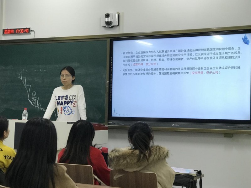 梁蕾同学认为直接抵免方面的知识较简单,因此为我们细致的讲解了较复杂的间接抵免。她用简洁明了的语言介绍了境外应纳所得税额、境外所得间接负担税额以及间接抵免的计算公式。又为大家讲了税收饶让抵免的应纳税额的确定。接下来付诸实践,根据公式讲解了两道例题,环环紧扣,让同学们的整个思路更加清晰。