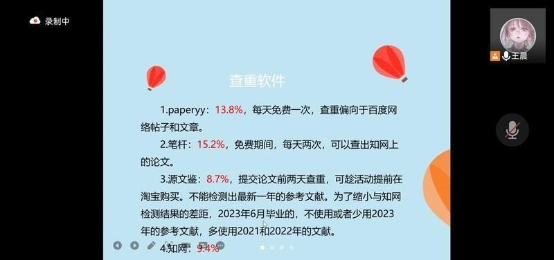 首先分享的是王晨同学。针对文献年限,她建议我们多使用当年文献,适当增加中检当年文献,少用毕业当年文献避;针对论文格式,她演示了页眉、分节符以及参考文献的格式设置技巧;查重方面,她建议我们分三个阶段进行三次自我查重,分别是初稿定稿查重一次、次年四月份查重一次和提交论文前查重一次,尽可能地降低论文重复率。