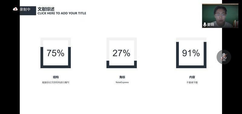 最后,是姜晓同学的经验分享。她建议减小研究背景的篇幅,将重点转移到向审批老师们展现论文的亮点上,并要注意将文献综述部分进行提炼;在阅读文献时可以使用NoteExpress这一软件,既可以快速找到曾看过的论文,也可以对参考的词句进行标注;姜晓同学对论文格式的修改进行了强调,她说明格式修改的程度更可体现作者的态度。