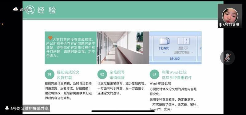 接下来是刘又维同学进行分享。在论文写作过程中,刘又维同学向我们分享了Word里的比较窗口,使用“比较”可以使得本次改动与上次改动的不同更加清晰明了,她还建议我们要提前完成初稿,及时联系老师进行审核;论文完成后的降重及检查阶段,刘又维同学建议查重时选择多个查重软件,针对几个查重报告中相同部分进行降重,可以提高效率,同时室友之间要相互检查,找出自己忽略掉的小小的不足,使论文更加完美。她还提到,整个论文行文过程一定要有耐心、细心认真,要不断提升文字能力,多阅读文献,最重要的是要多和老师沟通,将论文完成得更好。