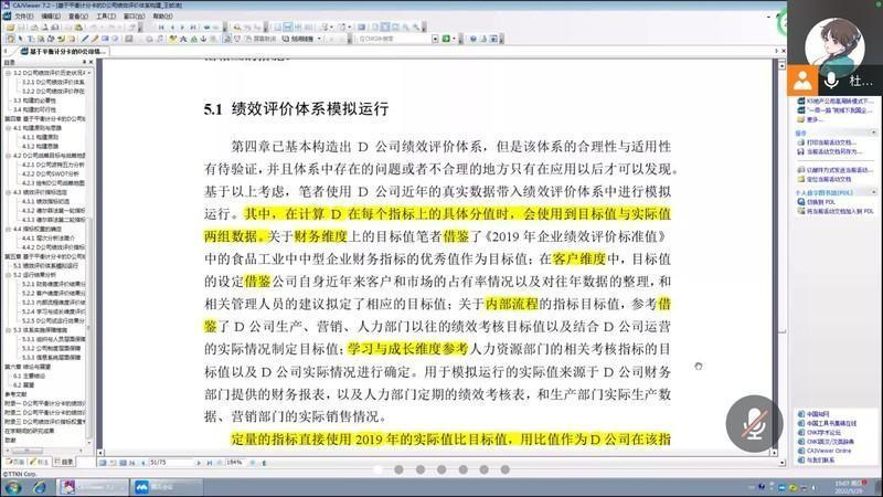 杜若依同学为大家分享的论文为《基于平衡积分卡的D公司绩效评价体系构建》。她指出,在确定战略目标时,文章作者先用波特五力模型分析行业竞争环境,然后用SWOT模型分析D公司的优势、劣势及核心竞争力,这样既有内又有外,使得企业的战略目标变得明朗。并且,文章中有一部分内容是关于这个建立的绩效评价体系的模拟应用,这样可以验证该体系的可行性,这样的思路值得我们去学习。
