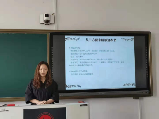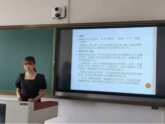 第三位上台分享的同学是190502班的钱明月,她主讲了本书主旨:稀缺心态的各种复杂成因,提出以“余闲”牵制稀缺的应对之法,对“带宽”进行合理规划和管理,我们才有可能从稀缺走向富足。
