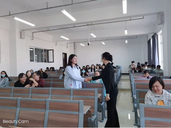 一宁老师不仅气质优雅,举止端庄,更将商务礼仪在面试竞争和初入职场中的重要性娓娓道来,瞬间吸引了同学们的注意力。她从面试着装搭配、仪表仪态等细节问题,再到职场日常礼仪、接人待物等方方面面逐一详细讲解和演示,同时和自己的助手完美配合,极大地调动了同学们的参与积极性。