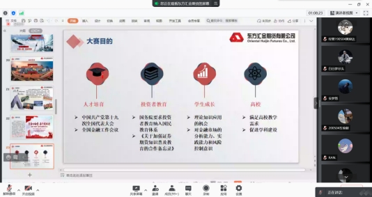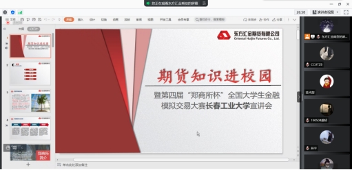 为提升学生衍生品交易能力,提高学生理论知识水平,鼓励学生积极踊跃地参加第四届“郑商所杯”全国大学生金融模拟交易大赛,9月22日15时30分,东方汇金期货有限公司的主讲老师为金融学专业2019级和2020级的学生带来了一场精彩的线上宣讲会。
