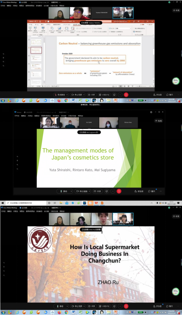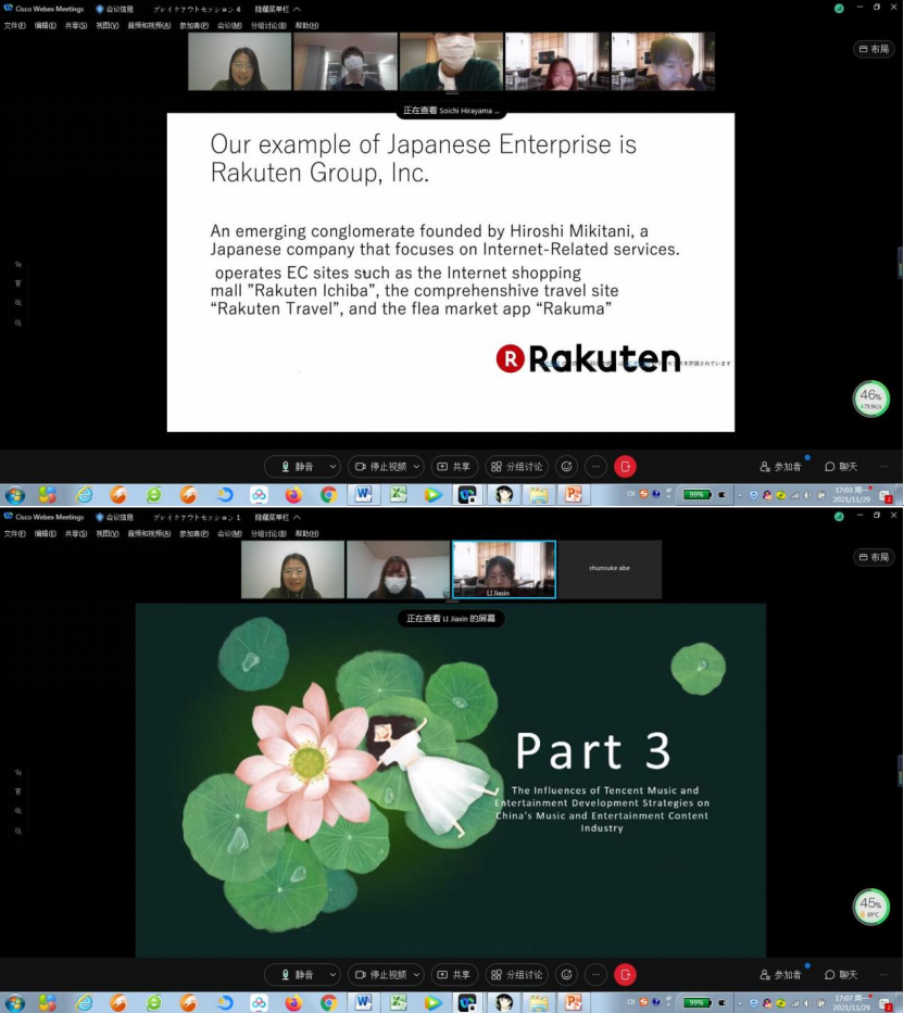 以2020年12月至2021年1月成功举办首届本科生国际交流活动为良好基础,经济系高鹤老师与日本中央大学经济学部和国际经营学部两位合作老师再次进行多次协调磋商,经过前期近两个月的充分准备,开启了第二轮本科生国际交流活动。2021年11月29日下午4点,高老师带领的2019级国贸专业学生团队和部分2020级学生与国际经营学部杨老师指导的研讨小组在Webex平台上如期相聚。