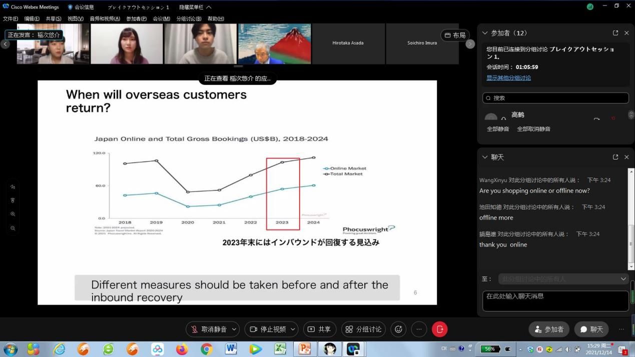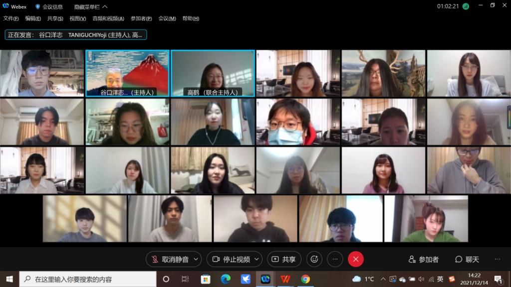 谷口老师和高鹤老师在分组发表期间认真聆听并参与提问和讨论,使得双方同学们收放自如,线上交流氛围轻松热烈。全部交流结束时,大大超出了预期时间,持续了将近3个小时。谷口老师再次肯定了本次交流活动取得的圆满结果,高鹤老师对十个队伍的发表进行了点评和总结。双方师生互送新年祝福,互发邀请,期待明年再次相见。