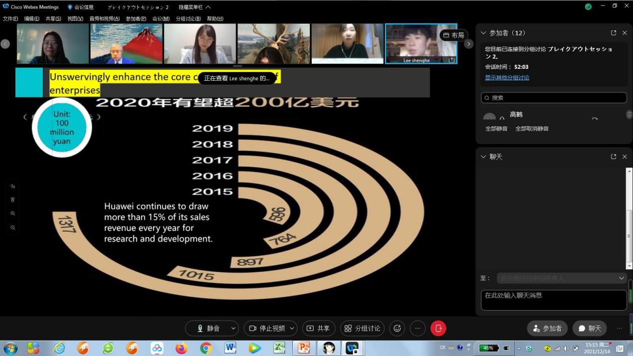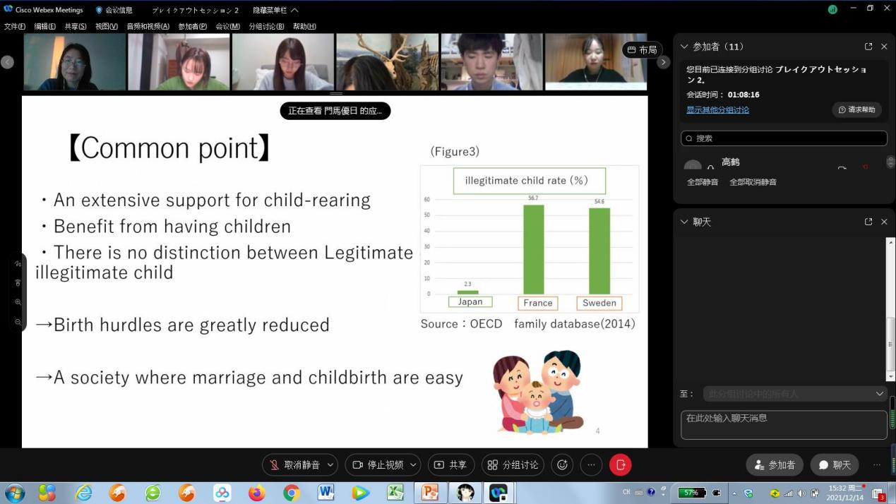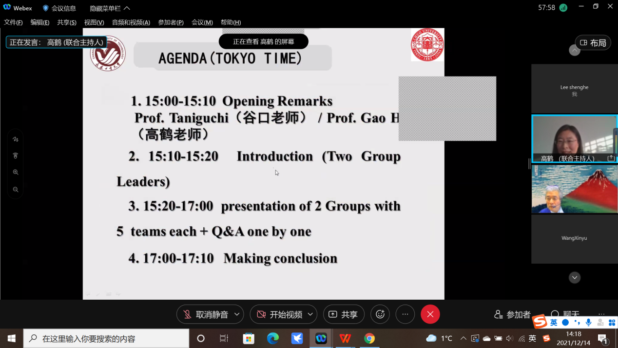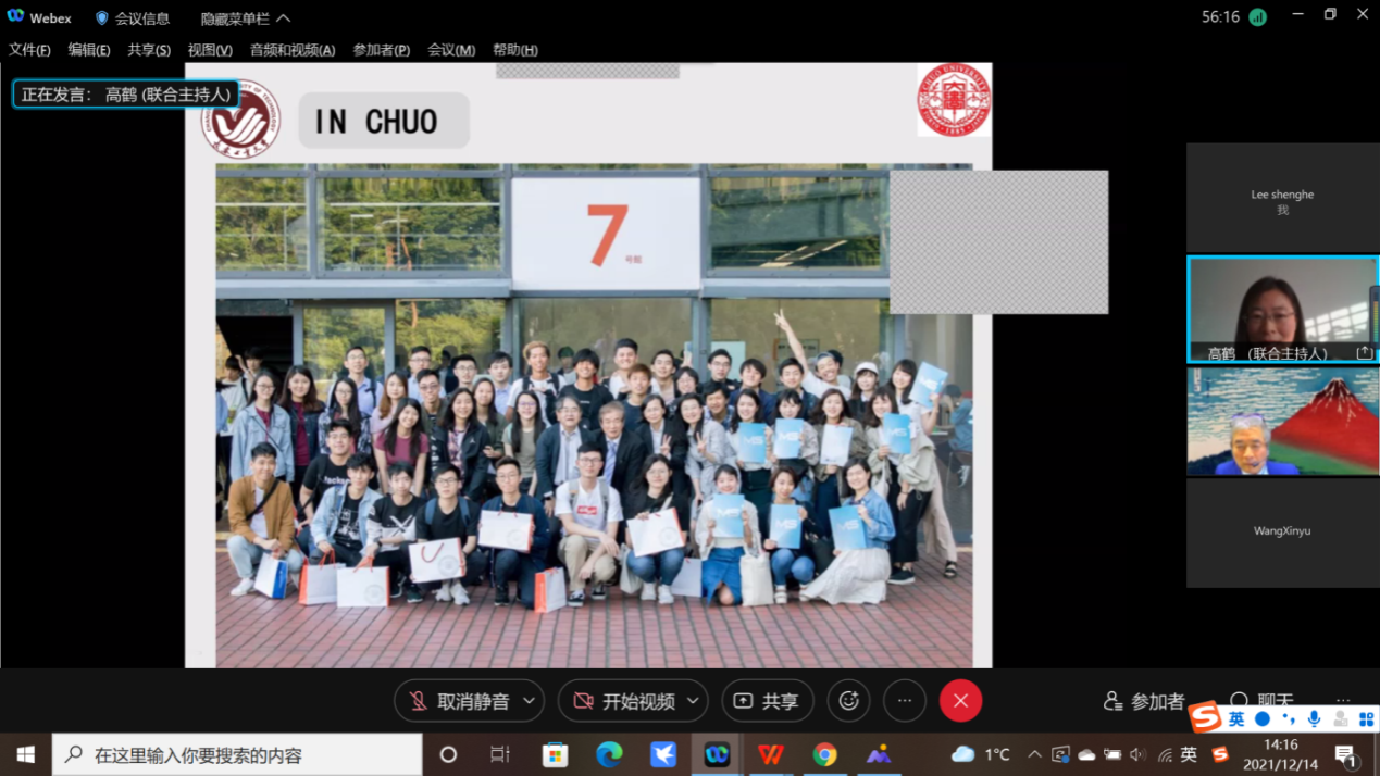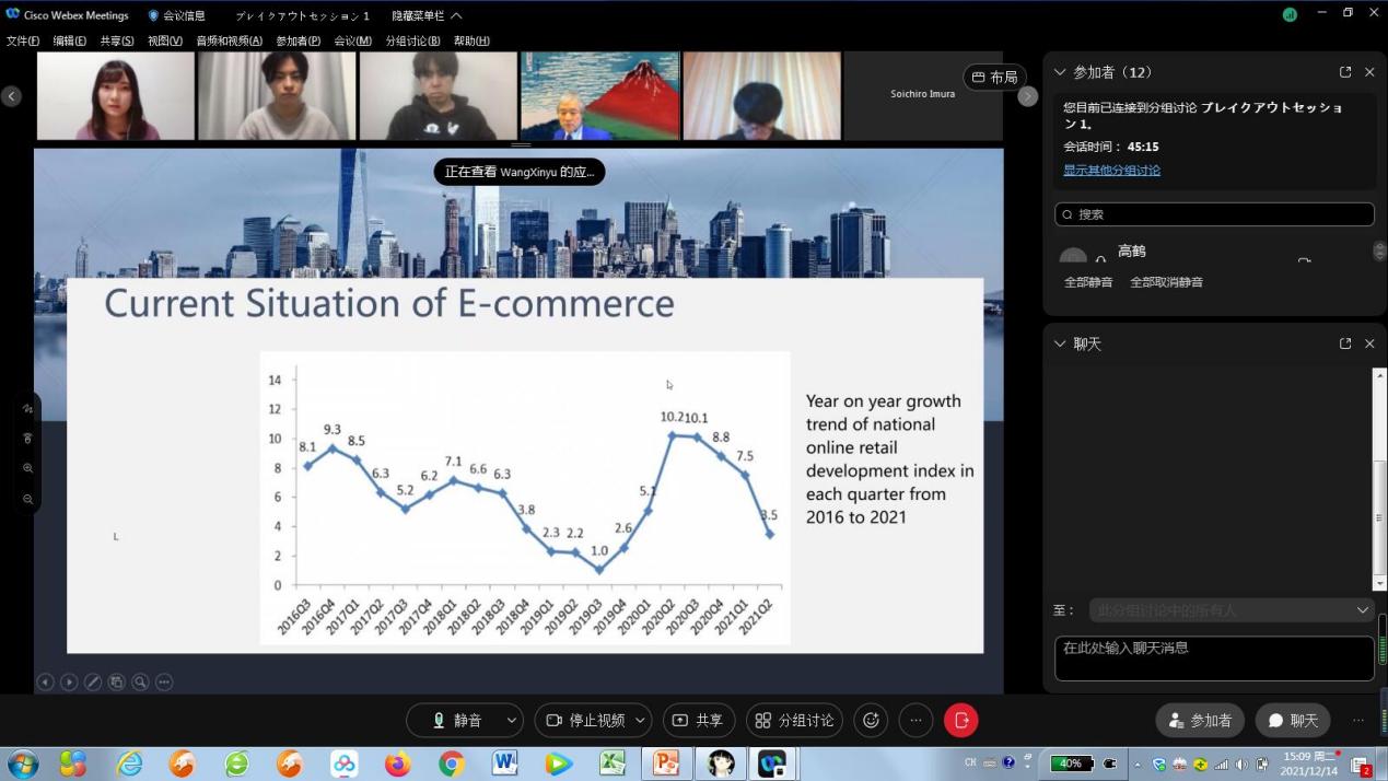 北京时间12月14日下午1:30,经济系高鹤老师带领2019级国贸专业学生团队与日本中央大学经济学部谷口教授指导的三年级研讨小组在Webex平台欢聚一堂,第二轮第二场中日本科生线上学术交流会如期开展,这也是两位老师第二次联手举办的系列国际交流活动,取得圆满成功。