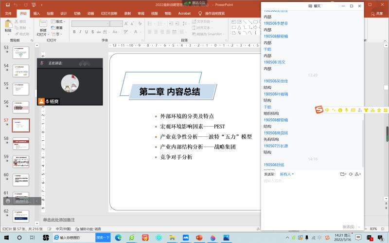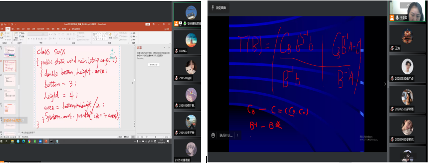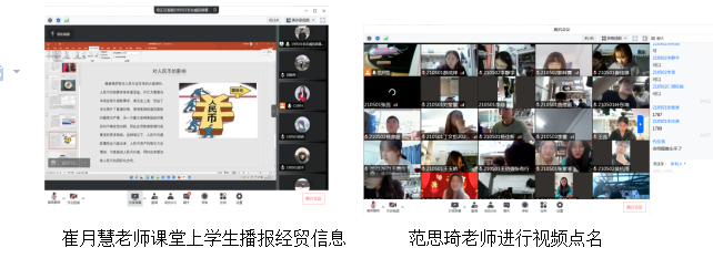 每位教师讲课各具特色,各有亮点。崔月慧老师结合俄乌局势由学生进行经贸信息播报;通过发放小礼物的方式激励学生回答问题,课堂气氛活跃,利用摄像头和对话框进行考勤。范思琦老师专业知识介绍密切结合中国实践,注重课程思政建设。李慧男老师将教材拍照,做成PDF格式发给没有教材的同学,很好地解决了疫情导致无法获得纸质教材的困难,通过投票方式进行考勤。董媛老师联系自身在俄罗斯的经历以及当下俄乌局势对国际金融的影响,由于贴近生活,学生十分感兴趣,积极发言讨论,活跃了课堂气氛。杨爽老师使用学习通与腾讯会议结合,完成课堂测验,答题,签到等环节,教师授课生动,学生踊跃参与。耿荣娜和王亚君老师利用手写板和腾讯会议中远程控制设置让学生可以远程书写公式。