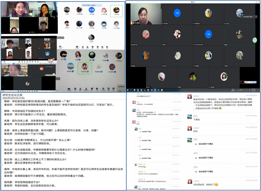在交流会中,老师们首先深入细致了解了同学们的疫情防控情况,叮嘱大家服从学校或所在社区的疫情防控安排,做好个人健康管理,另外还对不同年级同学提出课程学习和论文撰写方面的规划和建议,鼓励同学们在疫情防控期间加强学习,保证学业的正常进度不被疫情打断,保质保量完成学业。与会同学也纷纷向老师们汇报了近期自身情况,并就自身学习和研究方面的相关问题与老师进行了充分的沟通和讨论。
