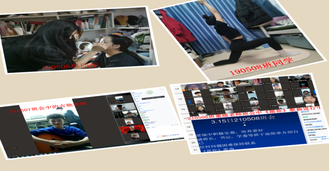 疫情防控期间,“好好待在宿舍”是最好的一种配合行动。但正值青春的同学们,学会以“艺”抗疫,丰富寝室生活,发现最美的自己。get化妆新技能,你来学,我来教。规律休息,做点安静的“瑜伽运动”。偶尔也用吉他弹唱,陶冶下情操。当然,我们的老师也会用歌曲来调节班会气氛,温婉柔情的董媛老师在班会中用一首《愿你》,在合适的时候给学生们送去最合适的歌曲。最后,真心地愿我们一齐携手,共同迎接美丽的夏花。