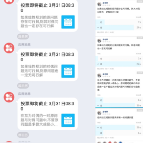 在课程知识点讲授之前,屈老师首先对上次课程作业的完成情况进行点评,回顾上节课程的主要内容,通过提问或者答疑互动检验学生学习效果、提高学生课程参与度,并以此引出当次课程的学习内容。在知识讲授过程中,针对运筹学课程理论性和实践性强的特点,屈老师在理论讲解时用通俗易懂的例子做比喻,增强趣味性,以具体问题为导向由浅入深逐步进行知识点解析。在教学手段与方法方面,一方面,采用屏幕分享课件与在线白板书写相配合,提高讲解效果;另一方面,通过互动投票、在线答题等交互环节调动学生听课积极性,激励学生进行思维碰撞,以培养学生独立思考的能力。
