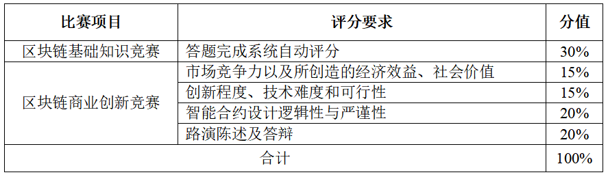 总成绩由两部分构成。区块链基础知识竞赛考核满分为100分,占总成绩的30%;区块链商业创新竞赛答辩成绩满分100分,占总成绩的70%,即:每支参赛队总成绩=区块链基础知识成绩*30%+区块链商业创新答辩成绩*70%。