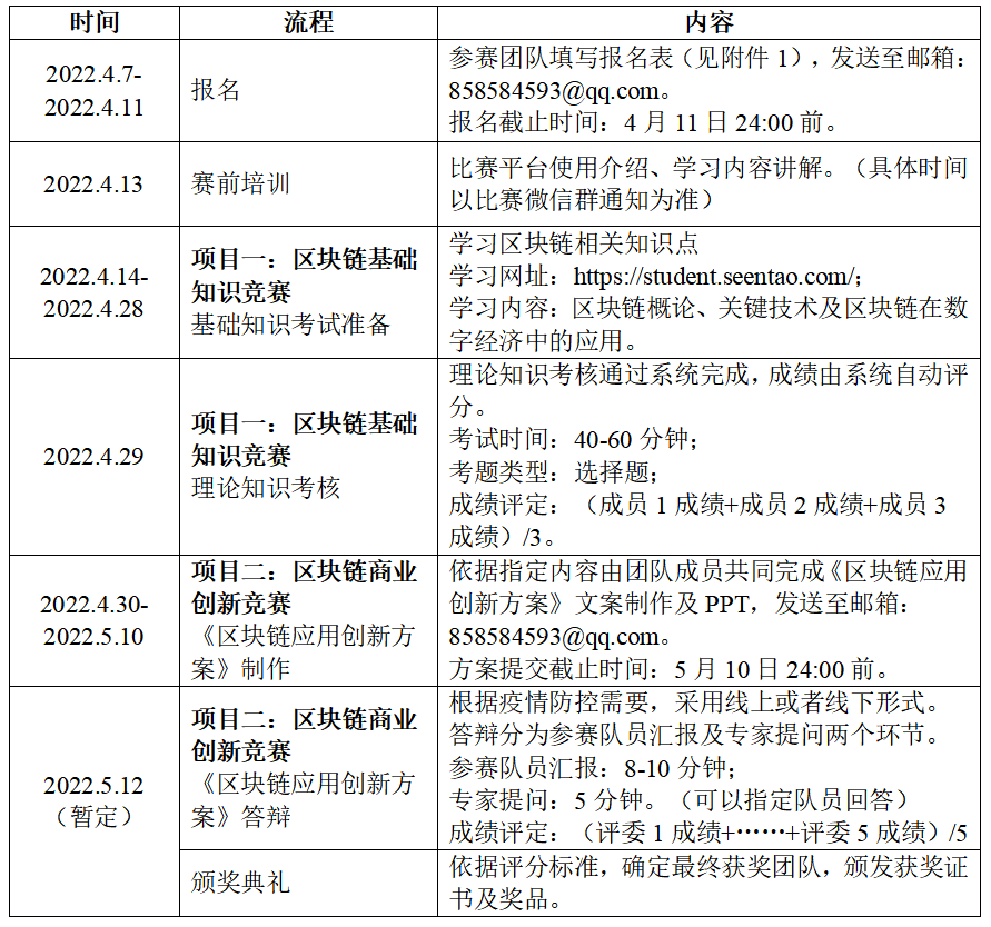 1.全国大学生区块链技术应用创新大赛吉林省赛时间为2022年6月,国赛时间为2022年10月。