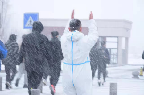 学生志愿者在雪中指引学生做核酸检测