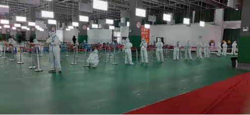 志愿者在体育馆中引导学生做核酸检测