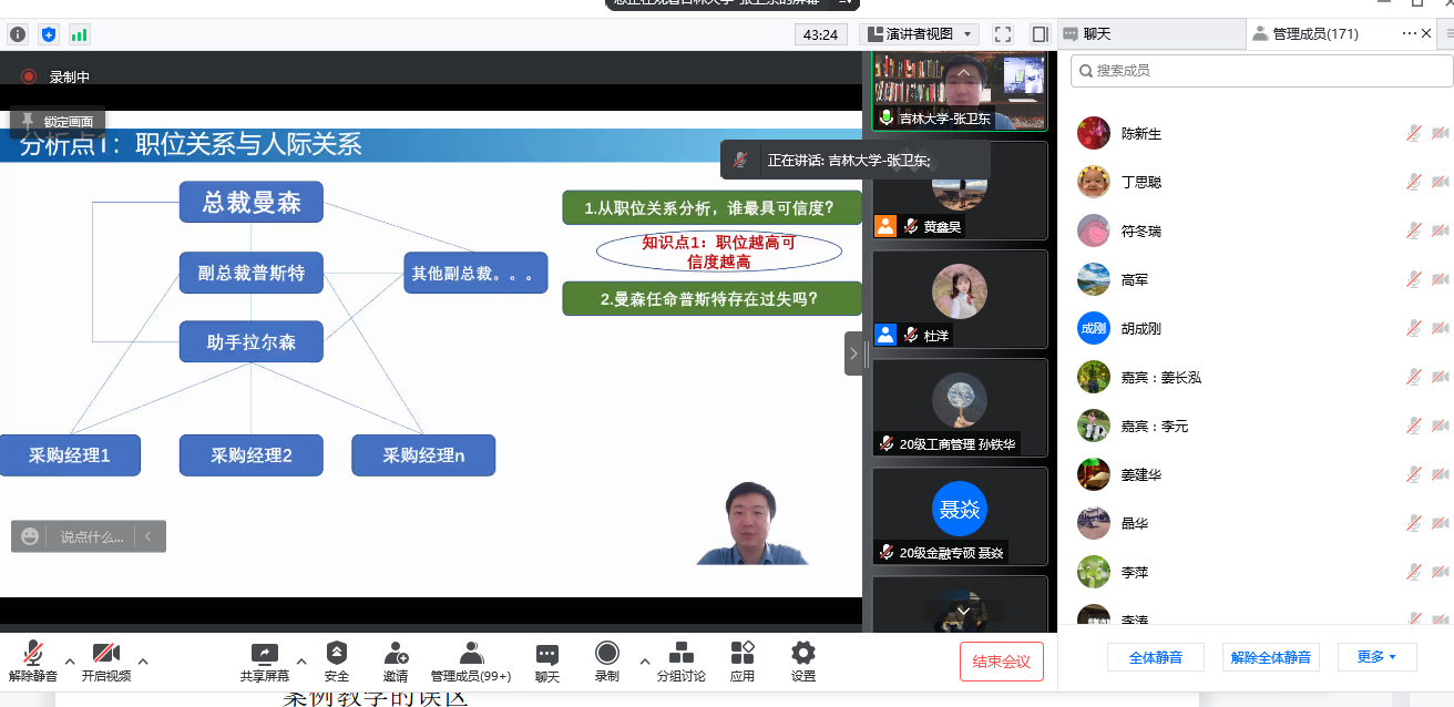 本次活动为MBA、MPAcc、MF专业学位研究生任课教师在案例教学组织与设计方面提供了经验借鉴,也为广大研究生在管理沟通实践方面提供了知识引导。学院将持续为师生提供学术交流平台,营造学术交流氛围,提升研究生培养质量。