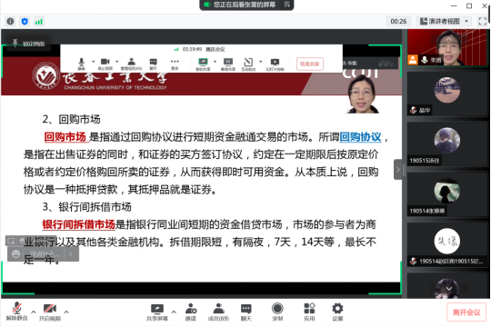 “吉林终有吉临日,长春定复常春时”,在这疫情形势不断转好,春意更浓的4月下旬,财会系的190514班和190515班学生开启了张雷老师《资本运营》新的课程学习。在校领导、院领导及各位教师的关怀中学习生活的学生们,满足了各餐美食、室外活动、清洁需求的活动同时,学习热情不减,在第9周的开学第一天,都怀着浓浓的学习兴致,一早即进入任课教师的授课平台。