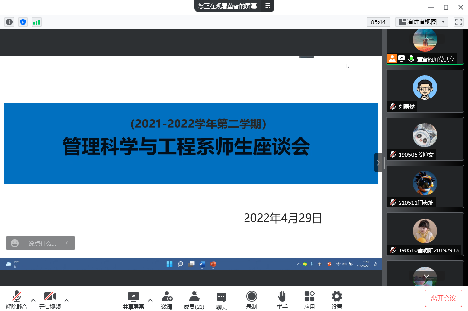 按照学校和学院关于期中教学检查的工作要求,为进一步了解学生本学期课程教学中存在的问题和相关建议,管理科学与工程系于2022年4月29日晚7时利用腾讯会议召开了期中教学检查师生座谈会。会议由管理科学与工程系副主任董睿主持,系主任刘泰然、系书记耿荣娜以及2019-2021级信息管理与信息系统、电子商务专业班长、团支书和学委等学生代表参加了本次会议。