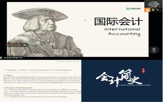 在全民战“疫”的特殊时期,李佳蔚老师精心准备着每一节线上课程,一台电脑、一部手机,成为了李老师和同学们沟通的桥梁。李佳蔚老师的《国际会计》课程从第九周开始授课,通过腾讯会议平台进行线上教学。在授课方面,李老师通过清楚明了、通俗易懂地方式对IAS和IFRS准则原文进行拆分讲解;结合具体案例引导学生思考,逐步进行分析,帮助学生们理解和掌握知识要点、难点;每个具体准则讲解完毕后李老师会带领同学做1-2道相关习题,通过问答的形式与同学们进行沟通,增强学生对课程的参与感,保证教学质量。线上教学缺乏良好的板书条件,李佳蔚老师选择在腾讯会议线上共享PPT,灵活应用网络板书将复杂的知识在标明重点后浅显易懂,使学生在课堂上快速抓住要点,提高了上课效率,保证了网课讲授效果。由于疫情原因,学生无法收到学校发放的纸质教材,李佳蔚老师精心准备教学资料,将课程用到所需的学习资料以及拓展延伸的电子材料放进微信群,便于学生学习使用,增强学生学习兴趣。本课程课程有助于同学们开阔视野,在学习国际会计准则的同时,比较中外会计准则区别,帮助同学们培养批判性思维。课堂氛围活跃,深受大家的喜爱。