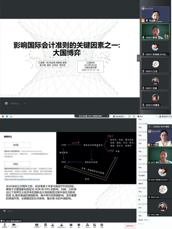 佳言善行,润物无声。为了让线上教学能取得理想的效果,激发学生上课的兴趣,《国际会计》课程中李老师让同学们自成小组进行文献报告,以了解国际会计准则研究现状,帮助同学们进一步掌握学习内容。文献由李老师提供,均来自于高水平期刊,研究主题紧密围绕国际会计准则的内涵和变化趋势,以保证文献质量和教学效果。这一举措不但提高了学生的课堂热情,也提高了他们的归纳、分析和汇报的综合能力。
