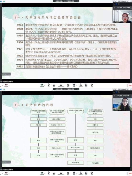 截止目前,《国际会计》课堂上共进行了两次文献汇报,大家各展风采。5月12日进行首次文献汇报的两个小组各有特色,从不同的角度切入。第一小组侧重于“述”,借助手绘图进行汇报,帮助大家理清文献思路、掌握文献全貌。第二小组侧重于“评”,向大家展示自己对此篇文献的所思、所想。5月19日进行了第二次文献汇报,这次的文献汇报有更多的小组成员积极参与到线上汇报环节中,从“幕后”转向“幕前”,让更多小组成员有线上展示的机会。同学们对这种文献汇报方式非常感兴趣,云端教室里的氛围轻松,同学们热情洋溢,课堂充满活力。李佳蔚老师也会对报告进行点评,在鼓励的同时,她也会给学生们提供一些小建议。线上心连心 教学永不停,文献汇报的展示仍在进行中。每名同学在小组中都扮演着不可或缺的角色,将在《国际会计》的课堂上展现出独属他们的风采与魅力。