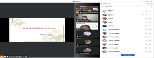 4月30日19:30—20:30线上召开了师生座谈会;系班子成员、教师代表和36名学生代表参加;座谈会就师生在教学及生活中存在的问题和意见建议进行了充分的交流。