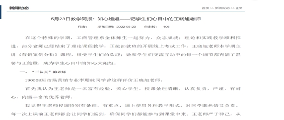 学校和学院教学简报介绍了多位工商管理系老师的授课典型经验,体现了校院两级督导以及学院领导对老师们辛勤付出的高度认可,同时也是对老师们的一种鞭策;管理系无论是年轻老师,还是老教师都在云端讲台展现了积极向上的精神风貌和教无止境的不懈追求。