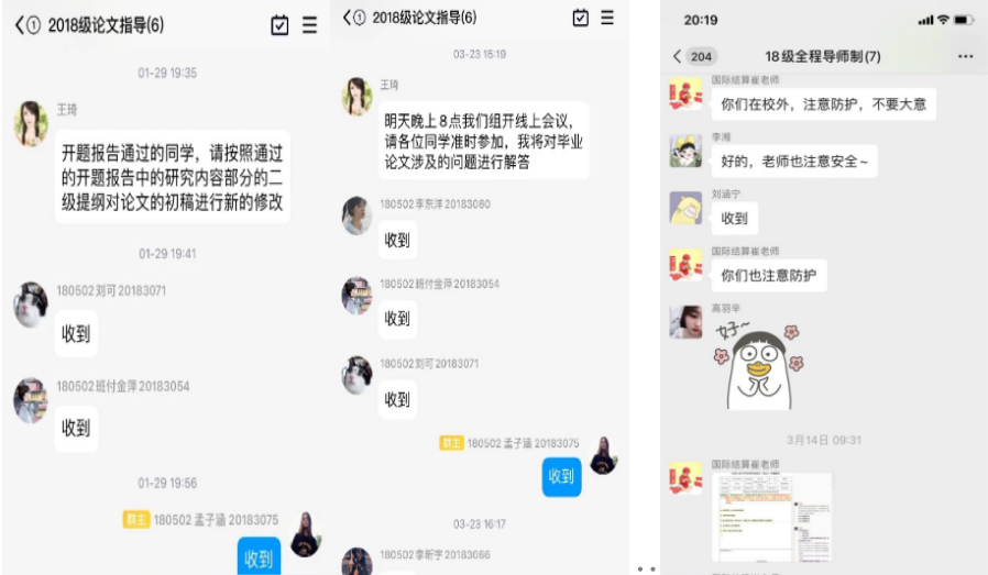 由于疫情的影响,毕业论文的指导工作也由线下改为了线上。老师们对所指导的学生进行了集中教学和分别指导,每一位学生都能够感受到老师对于论文指导的认真、负责、细致、耐心的态度。老师们根据每位同学的情况提出指导意见,因材施教,对于同学采取循循善诱的指导方式,并具有针对性的对论文写作方向与内容进行指导,对于学生的论文写作起到了启发性作用。在论文写作过程中有任何不明白的问题,比如参考文献的查询、数据的查找等问题,每一次有问题询问老师,老师都在第一时间给予回应。老师们还推荐了学术水平较高的期刊,建议学生在先阅读优秀的本科生、研究生论文和权威文献开阔眼界的基础上提升自身的知识积累。