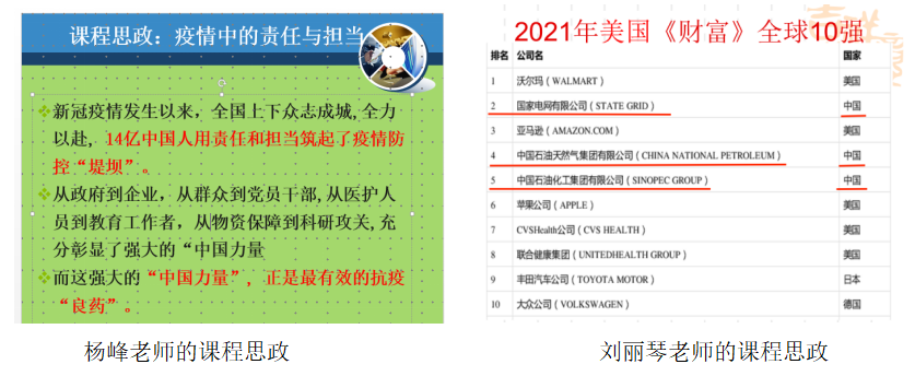 经济系的老师在授课时,将教学内容与课程思政紧密结合。例杨峰老师在讲解《财政医疗卫生支出》时,恰当融入“疫情中政府、医护人员和教育工作者的责任与担当”思政元素,培养学生责任感和勇于担当的精神。刘丽琴老师讲授跨国公司发展时,介绍了中国跨国公司的发展历程及在世界上的地位,极大地激发了同学们的爱国热情。
