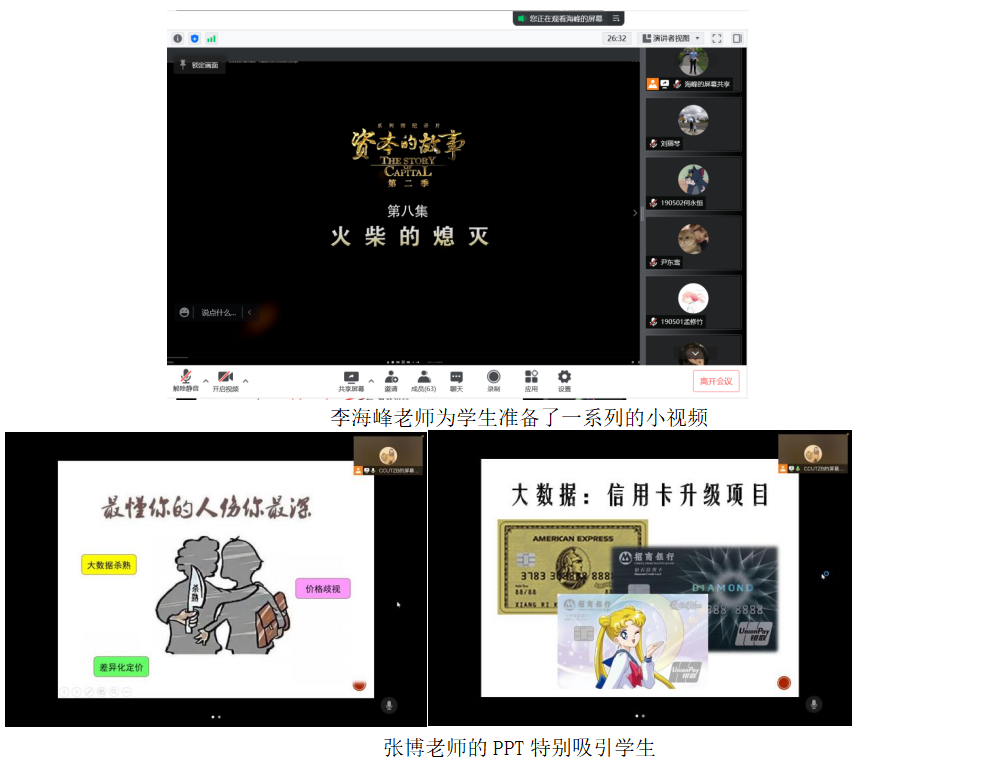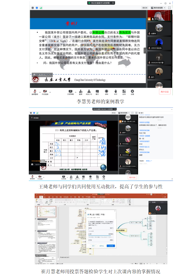 为保障线上教学效果,提高学生的参与性,经济系各位老师各显其能,采用了多样化的教学方法。老师们大多选用了视频资料,结合专业知识在恰当的时间进行播放;利用腾讯会议的互动批注或雨课堂的墨迹功能对课程的重点内容进行特殊标注;利用签到功能检验学生的听课状态;与学生一起制作视频或录制和演唱抗疫歌曲而产生师生共情;发动学生播报经贸信息或进行互联网金融路演提高学生学习的主动性;通过腾讯会议的投票功能检验学生对上节课内容的掌握程度;发动学生进行答题竞赛提高学习的乐趣;实施赠送礼物或发送红包奖励互动频繁的学生。