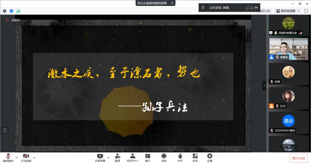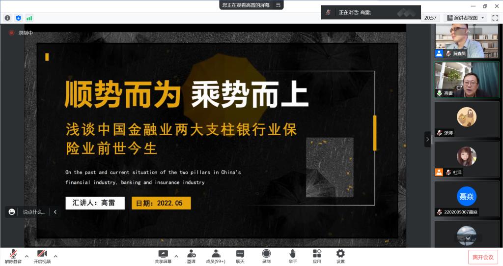 凝聚校友力量、传承经管文化、学习榜样精神、助力学子成才,2022年6月10日18:30,校友论坛2022年第5期在腾讯会议端举行,365英国上市集团2008级校友高雷作了题为“顺势而为乘势而上银行业保险业前世今生”的报告。学院部分教师、研究生及本科生参加了论坛。论坛由副院长黄鑫昊主持。