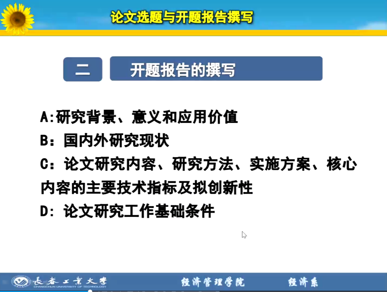 接着,王琦老师从研究背景、研究意义和应用价值;国内外研究现状;论文研究内容、研究方法、实施方案、拟创新性;论文研究工作的基础条件;与研究工作相关的主要参考文献等五个方面阐述了应该如何撰写学年论文。