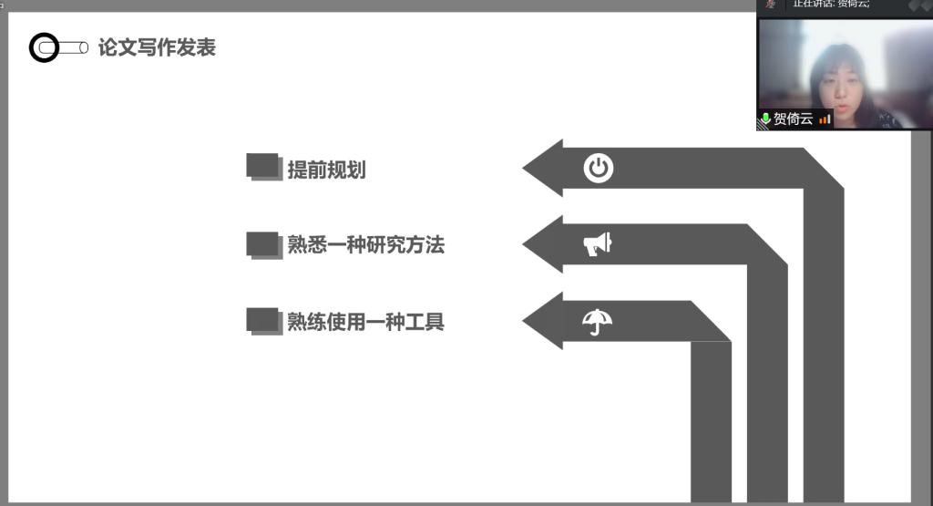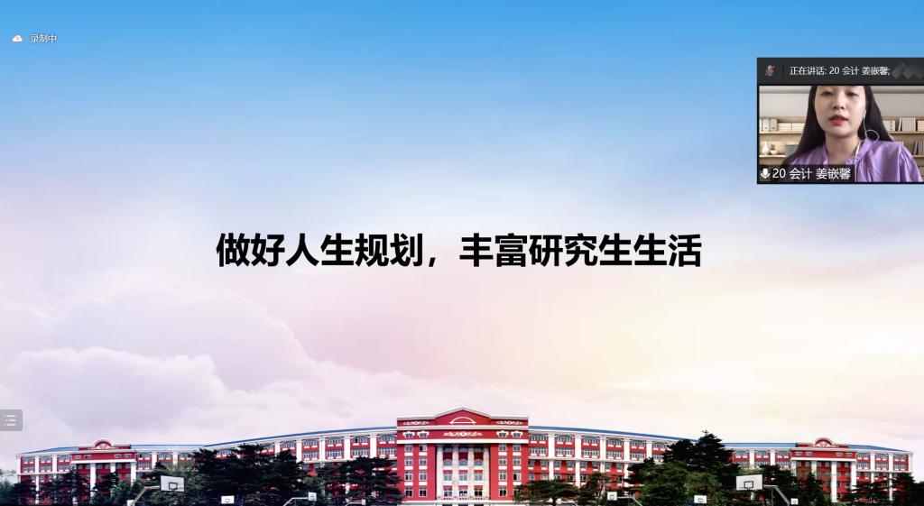 接下来,学院20级优秀研究生代表姜嵌馨和贺倚云为22级新生进行交流分享。姜嵌馨从入学规划、如何丰富研究生生活以及未来职业发展方面向大家交流心得;贺倚云向新生介绍了自己学术研究发表核心期刊经历,鼓励22级新生们做好规划、厚积薄发。
