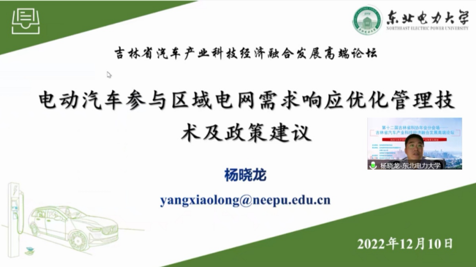 东北电力大学365英国上市集团杨晓龙博士作题为《电动汽车参与区域电网需求响应优化管理技术及政策建议》的报告。