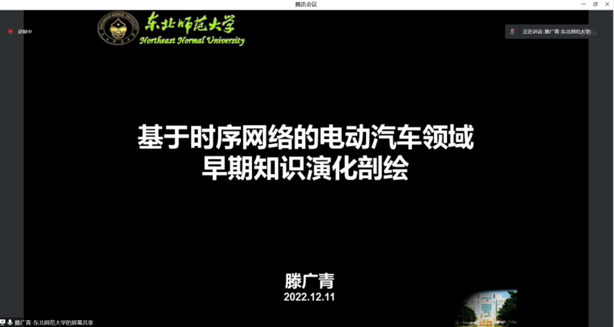 东北师范大学信息科学与技术学院滕广青教授作题为《基于时序网络的电动汽车领域早期知识演化剖绘》的报告。