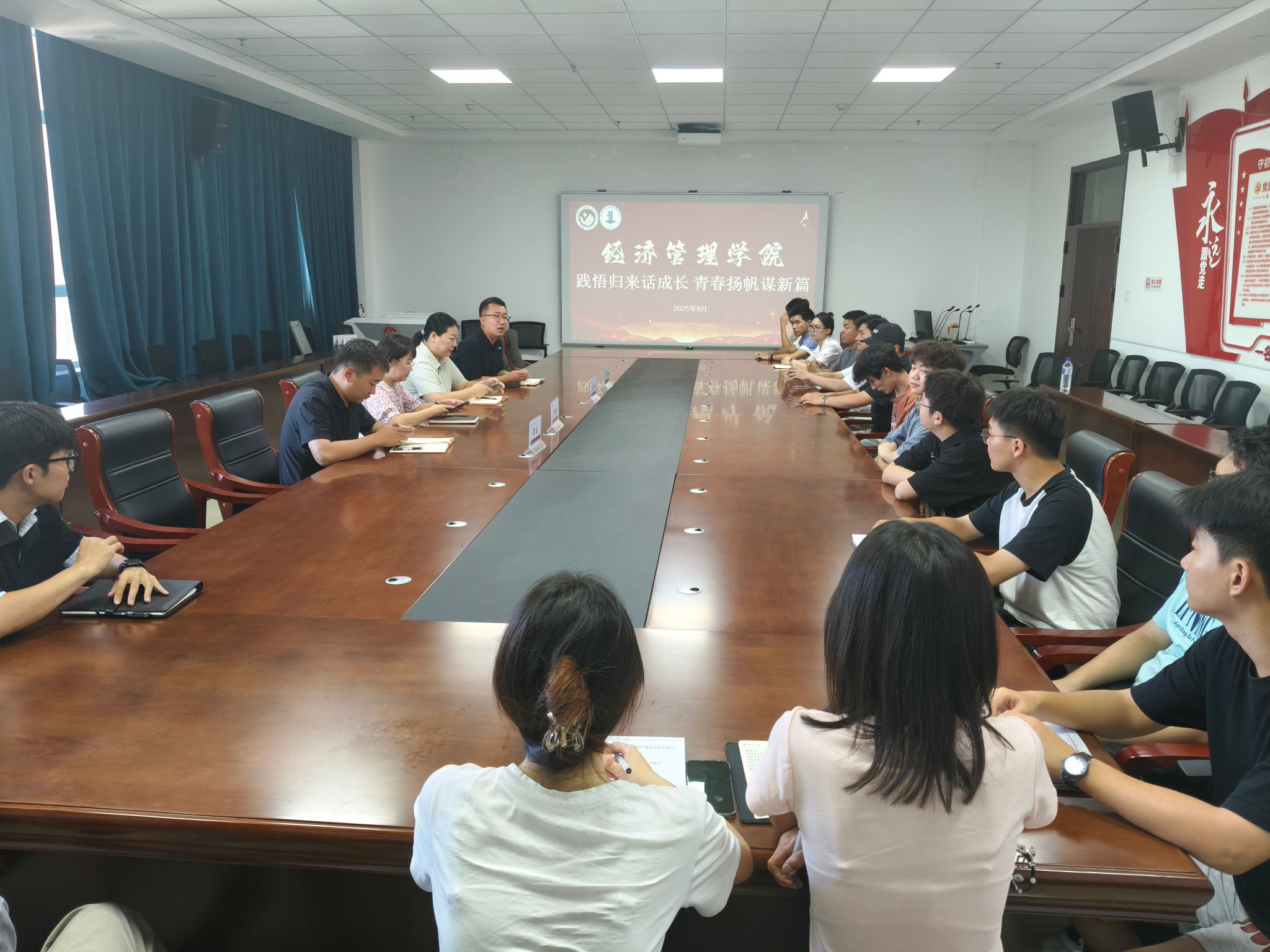 为精准把握学生新学期返校后的思想动态变化,切实了解学生在学习、生活、思想等方面的实际需求。经济管理学 院于 2025 年 9 月 2 日在学院 521 会议室召开新学期学生思 想动态座谈会。会议以“践悟归来话成长,青春扬帆谋新篇” 为主题,通过思想汇报、问题反馈、师生互动等环节,全面梳理学生思想脉络,凝聚发展共识,为新学期工作明确方向。