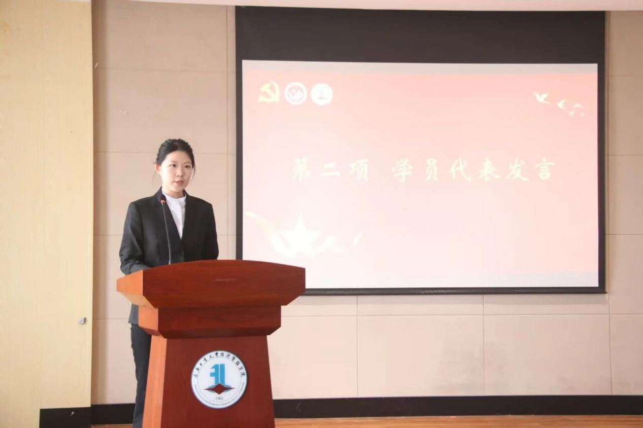 王婧如代表全体学员发言,她致谢学院党委为全体学员提供的宝贵学习机会,并结合在党的领导下各项事业取得的丰硕成果,表达对加入中国共产党的热切向往。她表示,全体学员将树立正确思想,认真学习党的理论知识,并承诺不断提升政治修养,自觉接受党组织的考验。