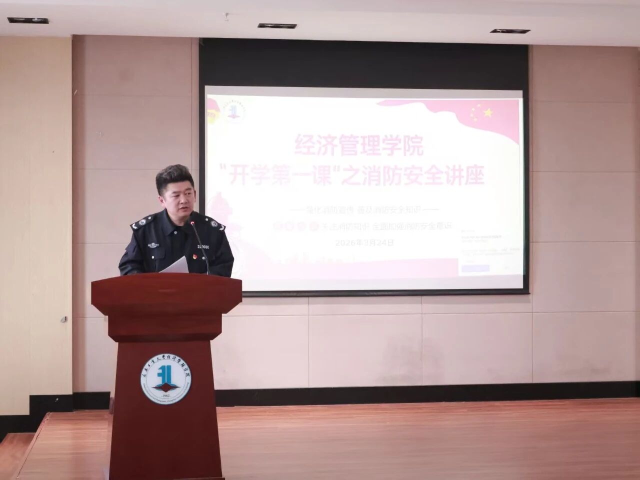 春季风大物燥,火灾隐患增多,安全风险较高,为进一步增强师生消防安全意识,提升自防自救能力,本次活动分为消防安全知识讲座与实战疏散演练两个环节,通过理论讲解与实操演练相结合的方式,提升师生应对突发火情的处置能力,筑牢校园安全防线。学校安全处防火科科长齐继东、治安科副科长朱帅良,朱昊博、严宝琴、孙响、朱涛,学院党委副书记刘坤及办公室全体辅导员出席活动。本次活动由团委宣传部副部长宣奇孜主持。