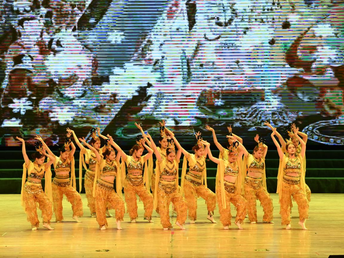 学院选送的民族舞《霓裳》,气势恢宏,场面宏大,队员们曼妙的舞姿与飞天的背景相得益彰,展现了中华民族灿烂的文化与传承。