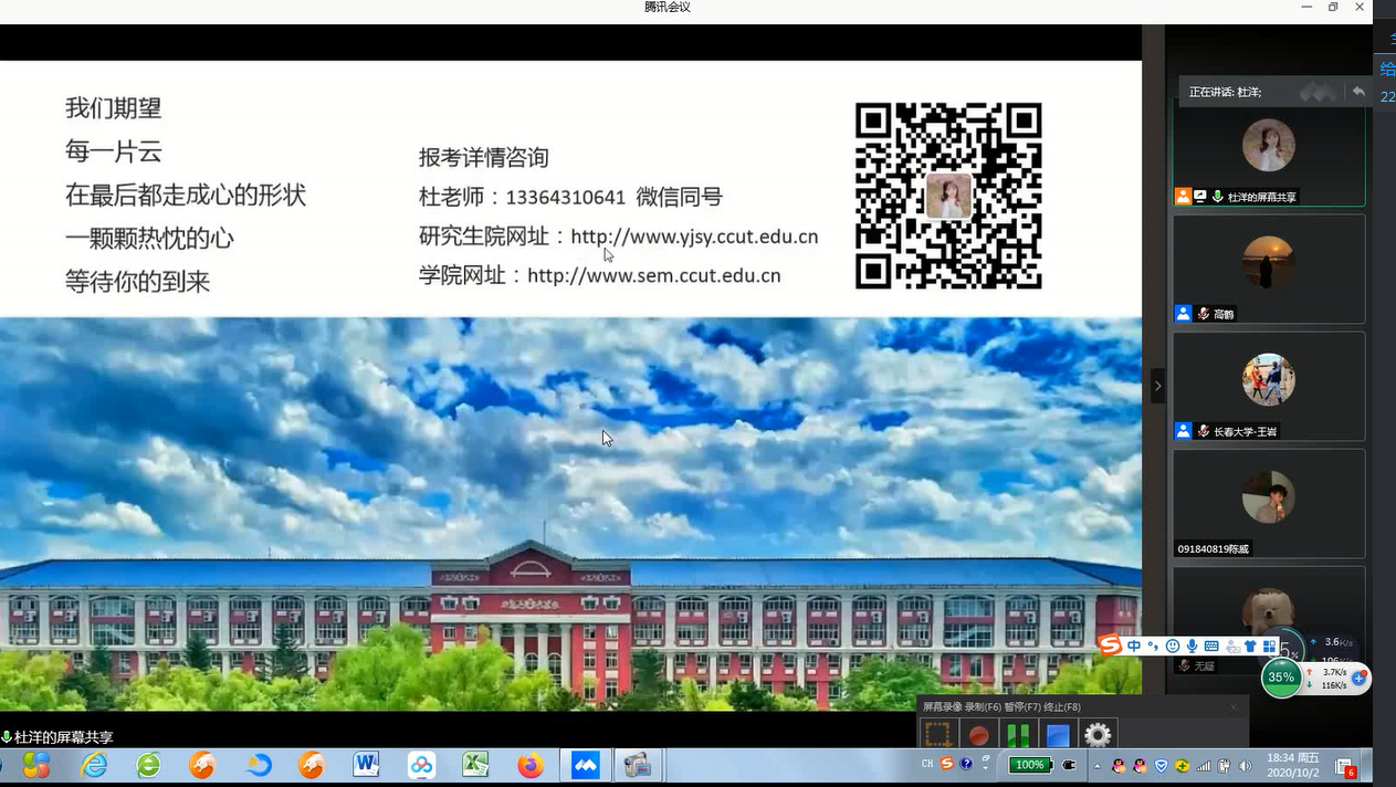 2021年硕士研究生招生工作启动以来,经济系广开言路、积极开展各种形式的招生宣传活动。系副主任高鹤与长春大学经济学院的相关领导和老师通过多次沟通,确定面向其2017级、2018级的国际经济与贸易专业和经济学专业的在校学生进行线上宣讲。10月2日,宣讲会如期举办,由我院MBA教育中心办公室主任杜洋作为主讲人,经济系主任张璇一同参加。