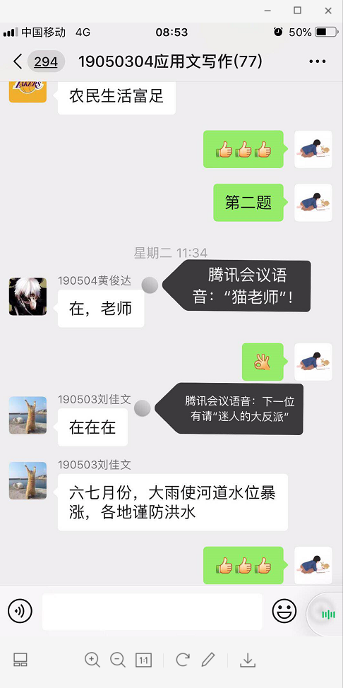 语音点了几个网名有特点的同学,让学生在微信群回答问题。
