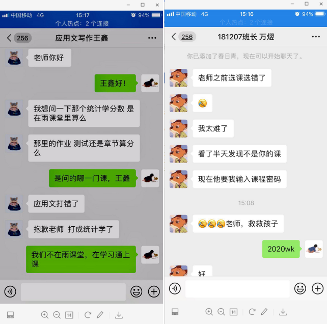 不同课程使用不同软件,登录不同平台,一不留神就乱套了!且看两位极致糊涂学生的微信。