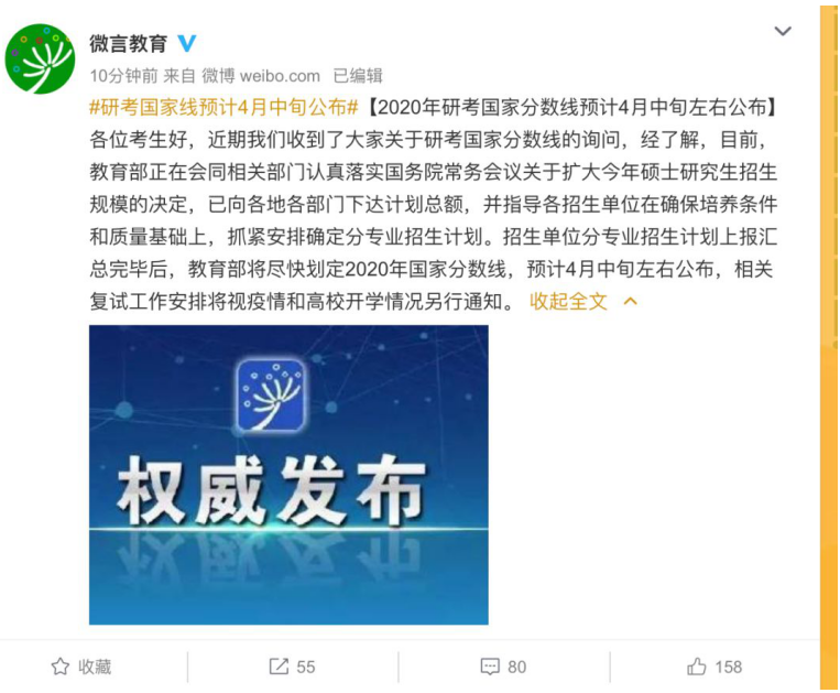 25日,微言教育正式发布权威消息,2020年研考国家分数线预计4月中旬左右公布。