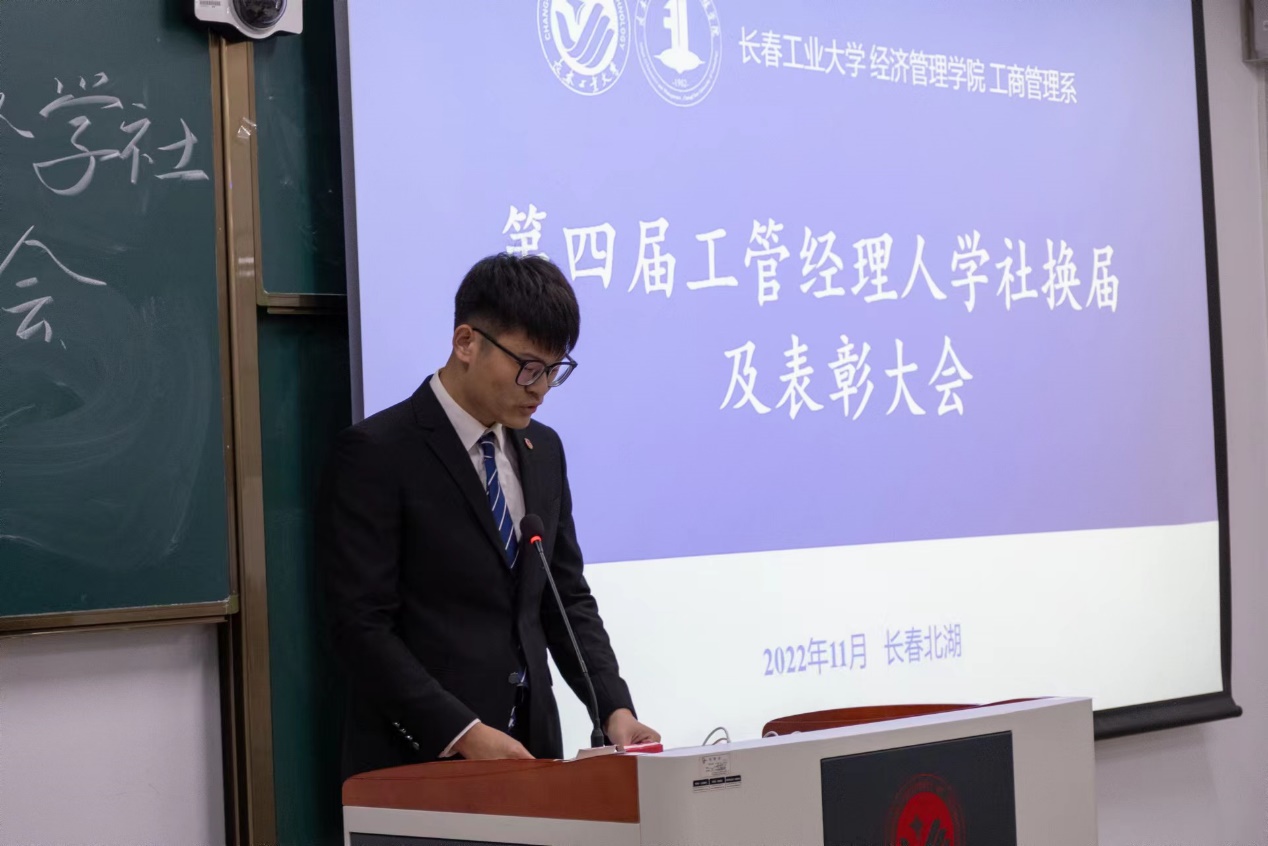 换届大会由第四届工管经理人学社副社长李凌宇同学主持。会议伊始,第三届工管经理人学社社长孙昊同学结合过去一年学社开展的各项活动进行了工作总结。他在总结中提到,学社过去一年来取得的成绩离不开工商管理系老师们的精心指导,更离不开参与竞赛、参与活动同学们的日夜鏖战和精心筹划。同时,他表示希望下一届学社成员能够带领全系同学继续推动学社的发展,把工商管理系建设的越来越好,更加发挥好老师与同学间的平台作用。