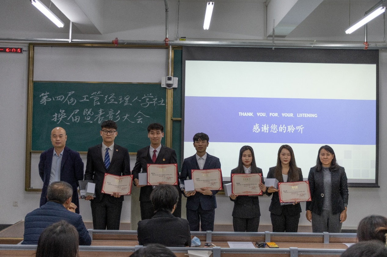 王明昊老师宣读了第三届学社优秀干部名单和第四届工管经理人学社组织结构及学社干部名单。王亚君、王明昊老师为第三届学社优秀干部颁发了荣誉证书及奖品,王明昊老师为第四届学社干部代表颁发了聘书。