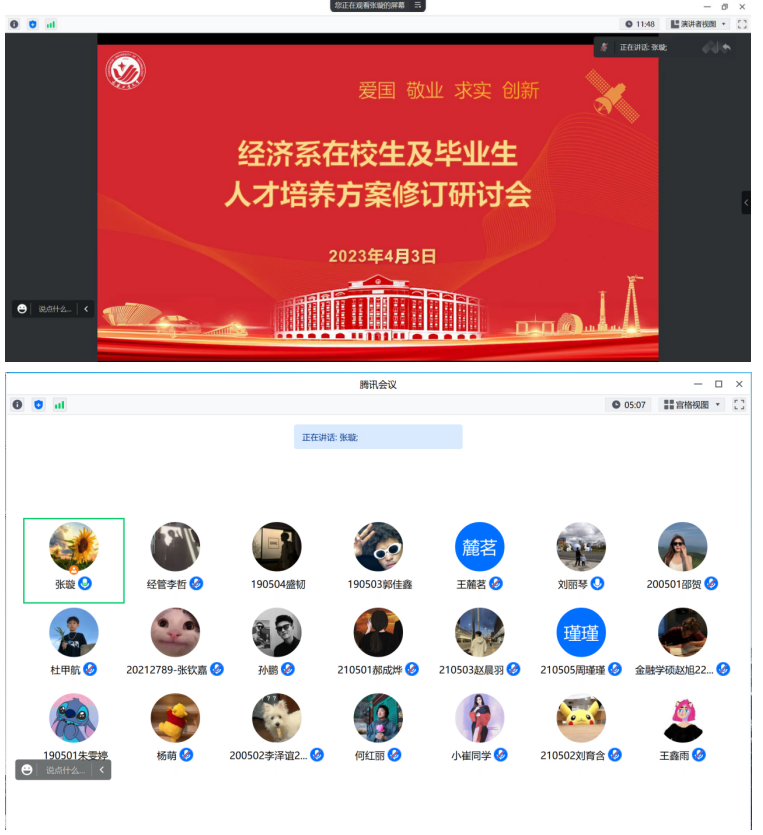 学院网讯(通讯员 崔月慧)为贯彻落实学校和学院关于人才培养方案修订的相关要求,进一步科学合理的修订人才培养方案和提高人才培养质量。经济系于2023年4月3日晚上19:00,利用腾讯会议于云端与在校学生和毕业学生代表召开人才培养方案修订师生研讨会。研讨会由经济系张璇主任主持,经济系副主任刘丽琴、经济系教师崔月慧以及在校生和毕业生代表参加了此次研讨会。