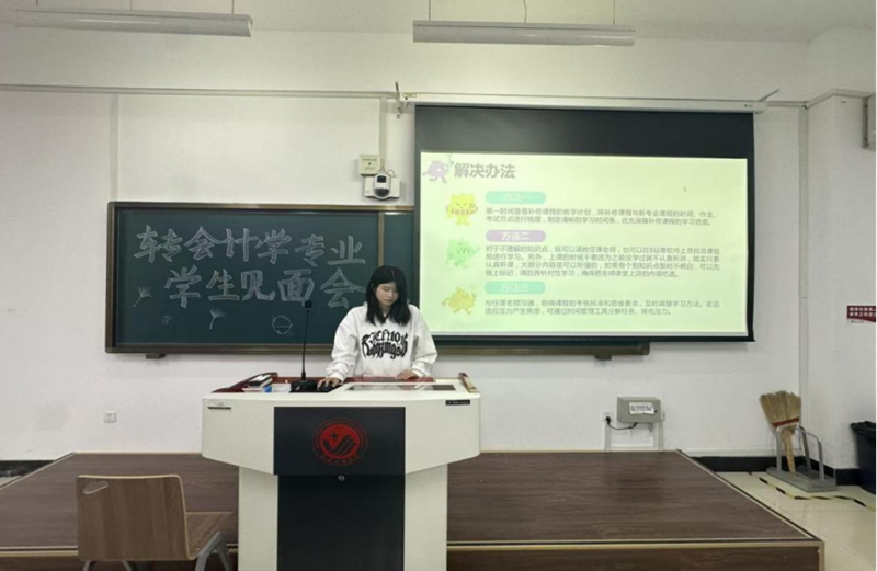 会上,23级张赫学姐结合自身学习经历,进行了精彩的学习经验分享。她从课程学习方法、专业证书备考、实习实践规划等方面切入,详尽分享了如何高效掌握会计学专业知识。面对学习中的困难,张赫学姐分享了她的应对之道,如组建学习小组互助解惑、利用线上资源拓宽学习视野、主动向老师请教专业问题等,这些实用经验让在场同学深受启发。